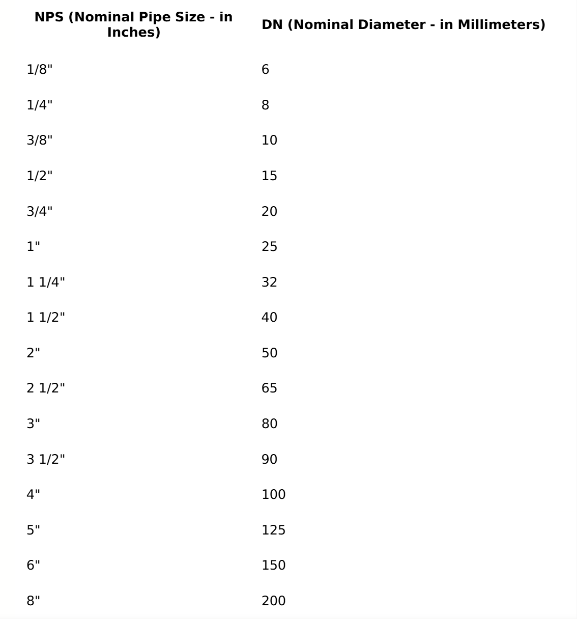 1" × 25 = DN25 2" × 25 = DN50 4" × 25 = DN100