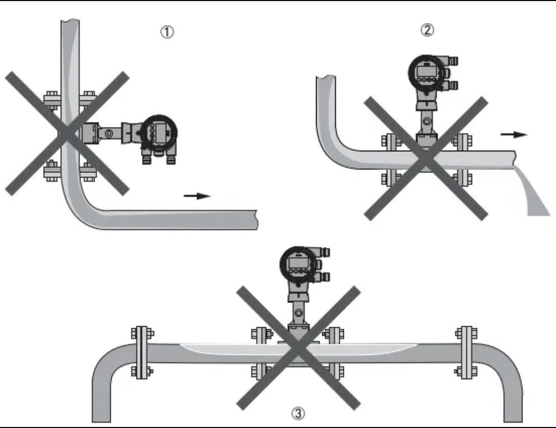 4. Ved måling af medier med høje temperaturer leverer producenterne typisk split-type vortex flowmålere. For integrerede vortex-flowmålere skal transmitterens orientering bestemmes ud fra mediets temperatur. Når man f.eks. måler damp ved høje temperaturer, skal senderen være orienteret sidelæns eller nedad (nogle producenter anbefaler ikke nedadgående installation, da væske kan trænge ind i transmitterhovedet).