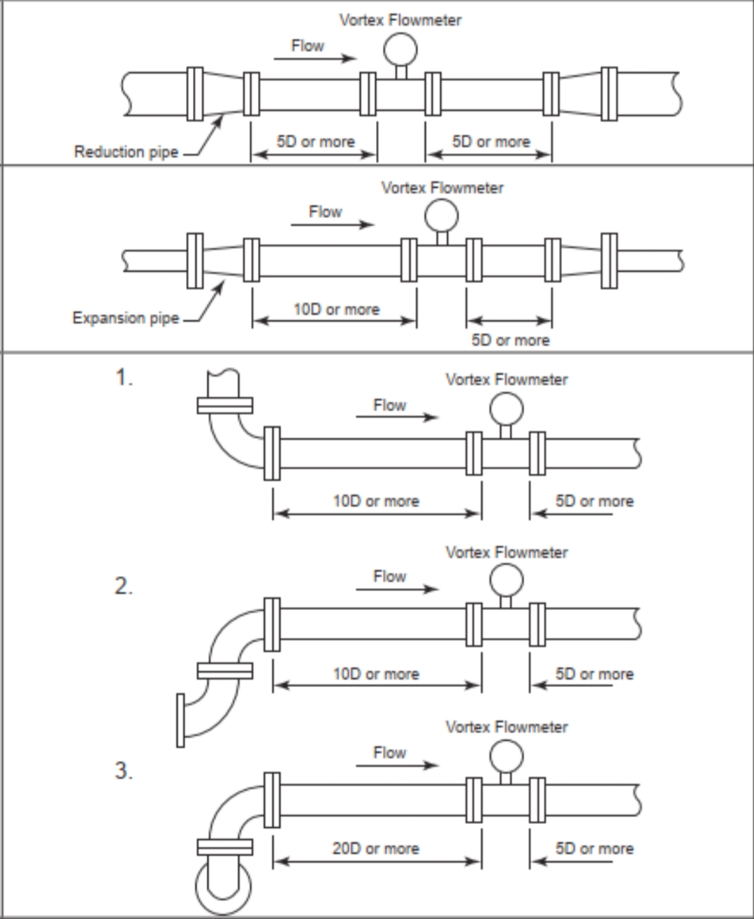 3.Lige rørsektioner opstrøms og nedstrøms (hvis temperatur- og trykinstrumenter er påkrævet, bør de installeres nedstrøms for flowmåleren. Nedstrømsinstrumenterne bør også placeres uden for den lige rørsektion. Den anbefalede arrangementsrækkefølge for flere instrumenter er: flowmåler, tryktransmitter, temperaturtransmitter). Generelt henvises til kravene til lige rørlængde, der er specificeret i producentens produktprøve (eller den almindelige retningslinje for 15D opstrøms og 5D nedstrøms i henhold til instrumentmanualer). Informer røringeniørteamet om kravene til opstrøms og nedstrøms lige rør til vortex-flowmåleren på forhånd. Når instrumentproducenten er valgt, skal installationskravene genbekræftes i henhold til fabrikantens specifikationer.
