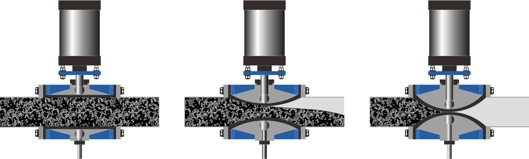 Luk: Drivmekanismen (manuel, pneumatisk eller elektrisk) skubber to spændestænger og komprimerer den elastiske bøsning præcist langs centerlinjen for at opnå en lufttæt forsegling. Selv når faste partikler er til stede i mediet, er de tæt lukkede og blokerede.